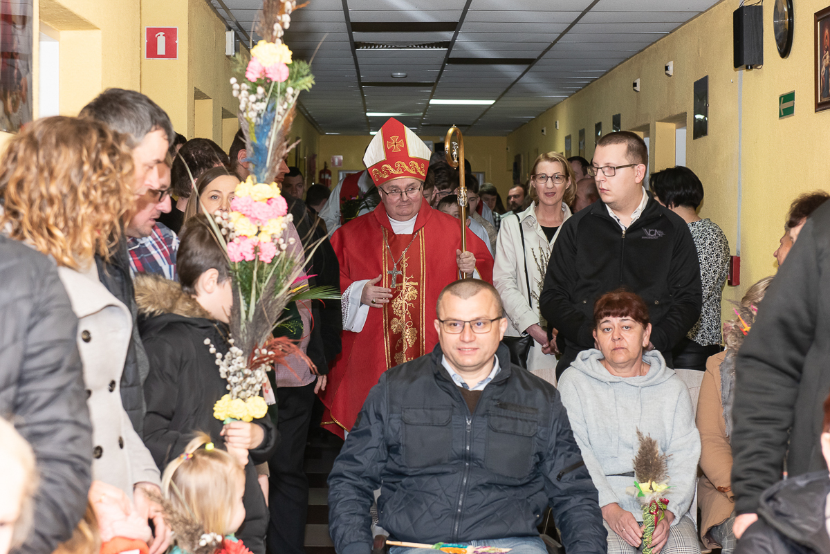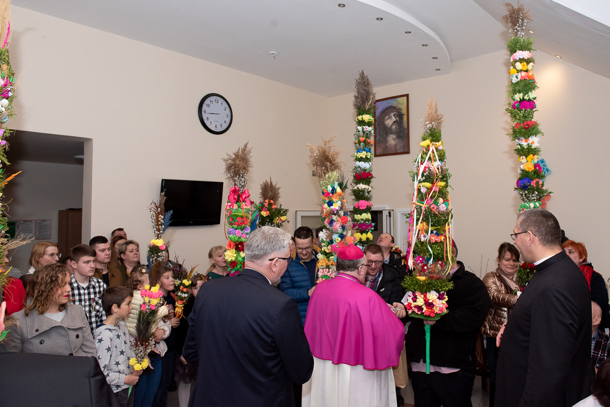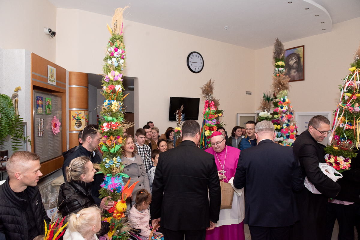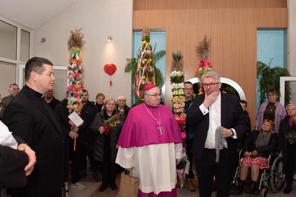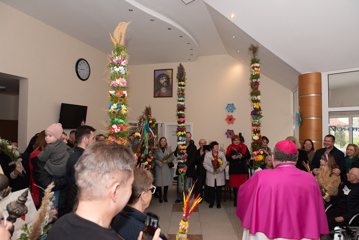 2 kwiecień to także, bardzo ważna data dla każdego Polaka, gdyż jest rocznicą śmierci Wielkiego Polaka świętego Jana Pawła II, co mocno wybrzmiało w kazaniu, które wygłosił ks. Biskup Janusz Mastalski, a także przekazał 4 wskazówki w formie „lekcji” jak budować silniejszą relację z Bogiem, a co za tym idzie z drugim człowiekiem. Na zakończenie mszy wszyscy uczestnicy wraz z pacjentami naszego Hospicjum dostąpili błogosławieństwa biskupiego. Pacjenci, uczestnicy Warsztatów Terapii Zajęciowej oraz Zakładu Aktywizacji Zawodowej, a także pracownicy i pacjenci fundacji przygotowali na tą uroczystość palmy wielkanocne, które zostały ocenione przez jury w składzie ks. Biskup Janusz, Prezes Fundacji ks. Gracjan, Dyrektor Caritas ks. Tomasz, Zastępca Dyrektora Caritas ks. Łukasz, niestety wybór był bardzo trudny, dlatego wszyscy wygrali z wyróżnieniem dla uczestników Warsztatów Terapii Zajęciowej, pracowników i uczestników Zakładu Aktywizacji Zawodowej, pacjentów w ramach warsztatów terapeutycznych Hospicjum, fizjoterapeutów, pielęgniarek i pacjentów Oddziału Rehabilitacji Ogólnoustrojowej. Każdy otrzymał wyjątkowy różaniec, słodkości oraz niezapomnianą niespodziankę od ks. Biskupa Janusza Mastalskiego. W imieniu pracowników, pacjentów i rodzin pacjentów jeszcze raz składamy serdeczne podziękowania za tak niesamowitą uroczystość dla ks. Biskupa Janusza, ks. Tomka, ks. Łukasz oraz Naszego Prezesa ks. Gracjana.