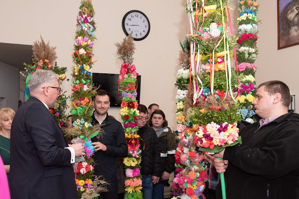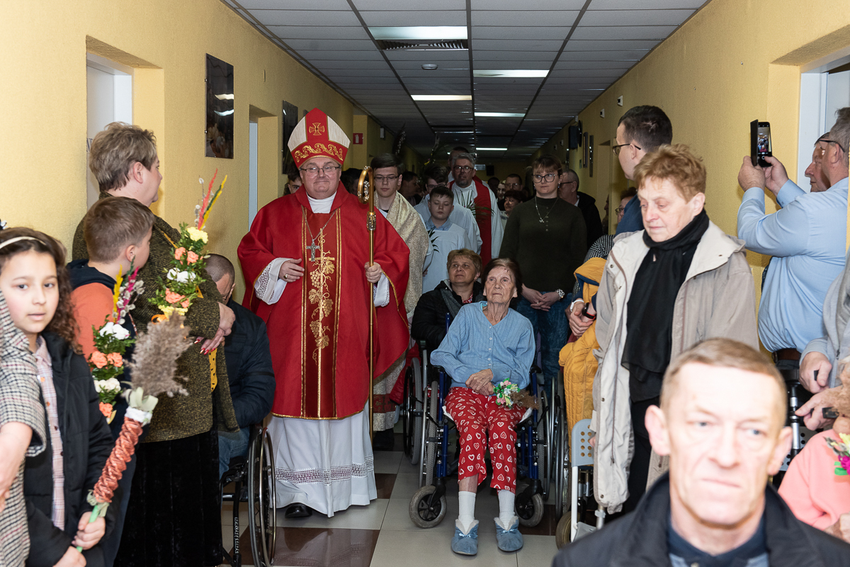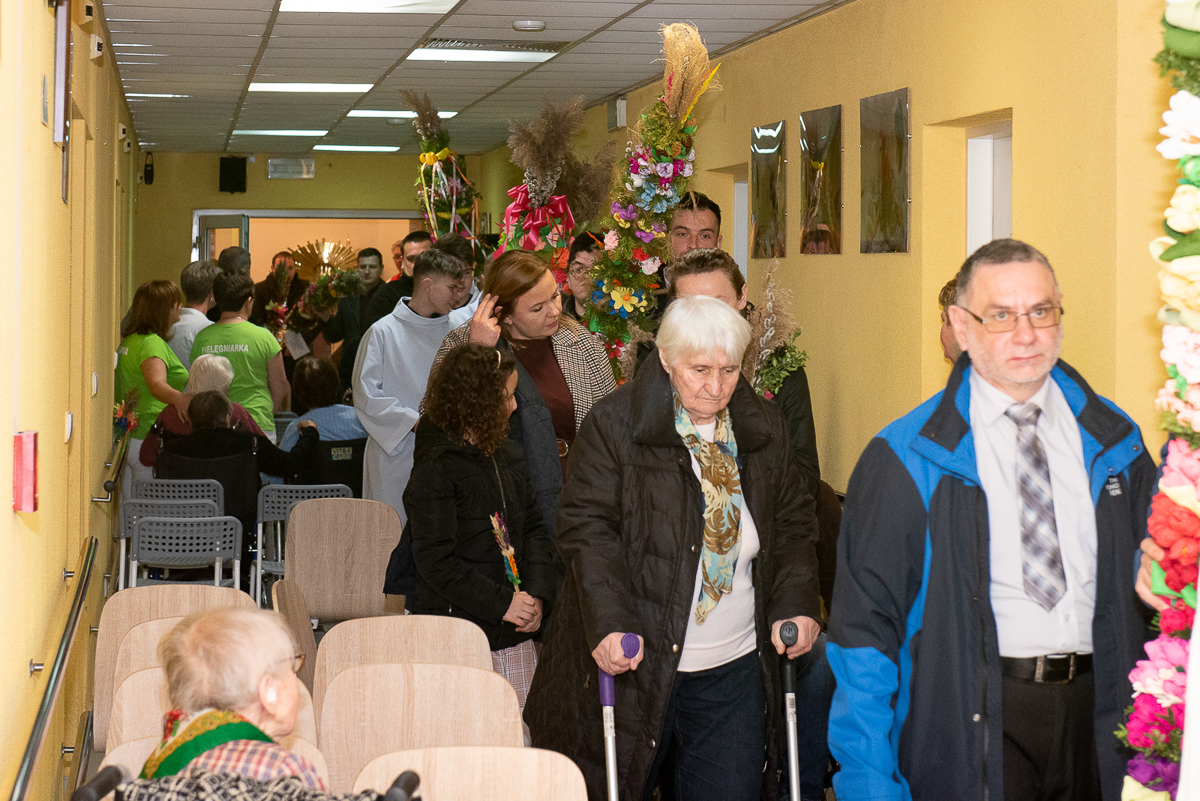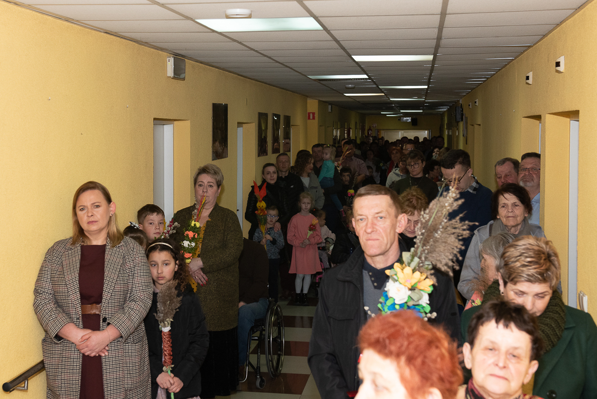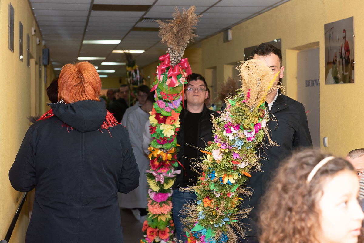 2 kwiecień to także, bardzo ważna data dla każdego Polaka, gdyż jest rocznicą śmierci Wielkiego Polaka świętego Jana Pawła II, co mocno wybrzmiało w kazaniu, które wygłosił ks. Biskup Janusz Mastalski, a także przekazał 4 wskazówki w formie „lekcji” jak budować silniejszą relację z Bogiem, a co za tym idzie z drugim człowiekiem. Na zakończenie mszy wszyscy uczestnicy wraz z pacjentami naszego Hospicjum dostąpili błogosławieństwa biskupiego. Pacjenci, uczestnicy Warsztatów Terapii Zajęciowej oraz Zakładu Aktywizacji Zawodowej, a także pracownicy i pacjenci fundacji przygotowali na tą uroczystość palmy wielkanocne, które zostały ocenione przez jury w składzie ks. Biskup Janusz, Prezes Fundacji ks. Gracjan, Dyrektor Caritas ks. Tomasz, Zastępca Dyrektora Caritas ks. Łukasz, niestety wybór był bardzo trudny, dlatego wszyscy wygrali z wyróżnieniem dla uczestników Warsztatów Terapii Zajęciowej, pracowników i uczestników Zakładu Aktywizacji Zawodowej, pacjentów w ramach warsztatów terapeutycznych Hospicjum, fizjoterapeutów, pielęgniarek i pacjentów Oddziału Rehabilitacji Ogólnoustrojowej. Każdy otrzymał wyjątkowy różaniec, słodkości oraz niezapomnianą niespodziankę od ks. Biskupa Janusza Mastalskiego. W imieniu pracowników, pacjentów i rodzin pacjentów jeszcze raz składamy serdeczne podziękowania za tak niesamowitą uroczystość dla ks. Biskupa Janusza, ks. Tomka, ks. Łukasz oraz Naszego Prezesa ks. Gracjana.