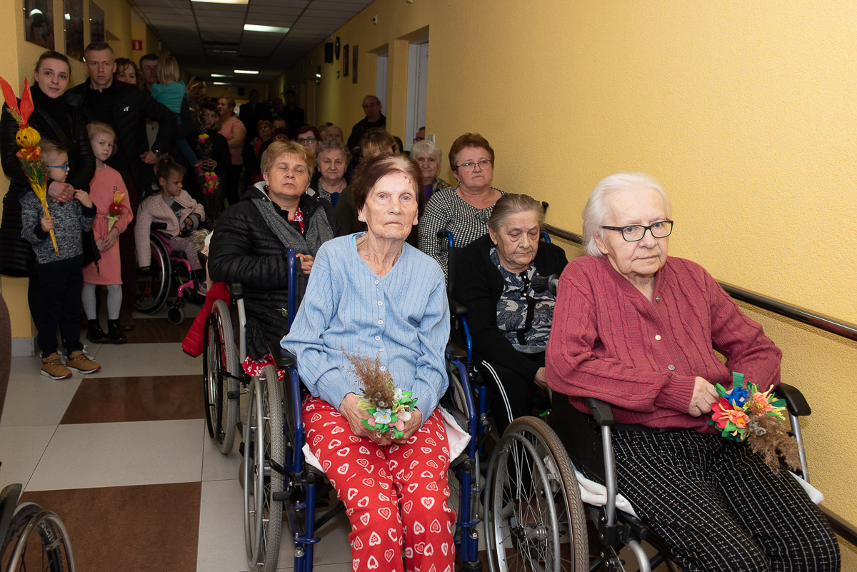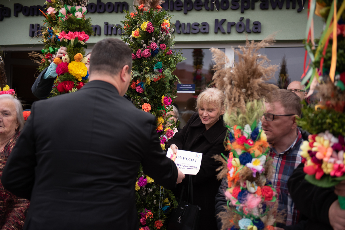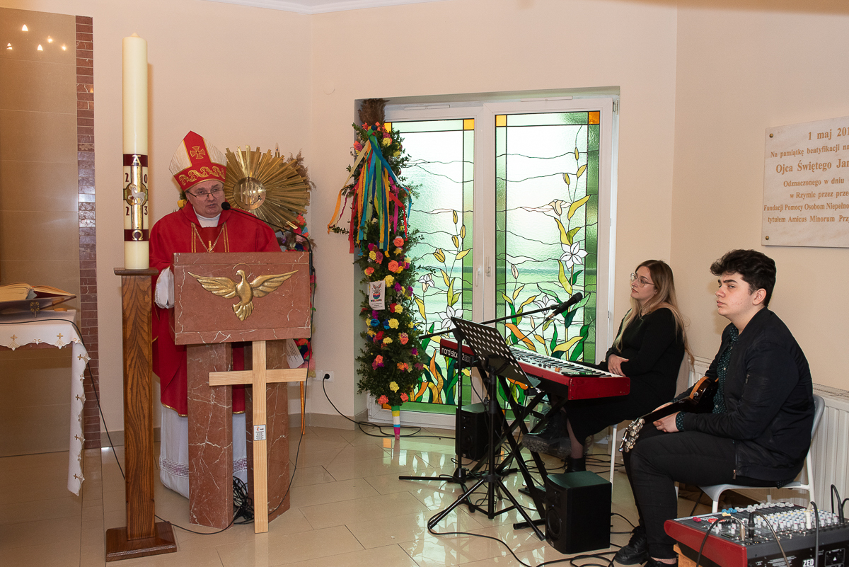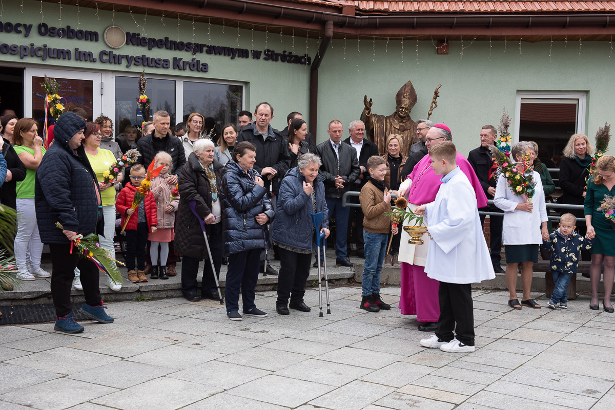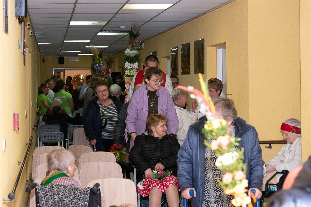 2 kwiecień to także, bardzo ważna data dla każdego Polaka, gdyż jest rocznicą śmierci Wielkiego Polaka świętego Jana Pawła II, co mocno wybrzmiało w kazaniu, które wygłosił ks. Biskup Janusz Mastalski, a także przekazał 4 wskazówki w formie „lekcji” jak budować silniejszą relację z Bogiem, a co za tym idzie z drugim człowiekiem. Na zakończenie mszy wszyscy uczestnicy wraz z pacjentami naszego Hospicjum dostąpili błogosławieństwa biskupiego. Pacjenci, uczestnicy Warsztatów Terapii Zajęciowej oraz Zakładu Aktywizacji Zawodowej, a także pracownicy i pacjenci fundacji przygotowali na tą uroczystość palmy wielkanocne, które zostały ocenione przez jury w składzie ks. Biskup Janusz, Prezes Fundacji ks. Gracjan, Dyrektor Caritas ks. Tomasz, Zastępca Dyrektora Caritas ks. Łukasz, niestety wybór był bardzo trudny, dlatego wszyscy wygrali z wyróżnieniem dla uczestników Warsztatów Terapii Zajęciowej, pracowników i uczestników Zakładu Aktywizacji Zawodowej, pacjentów w ramach warsztatów terapeutycznych Hospicjum, fizjoterapeutów, pielęgniarek i pacjentów Oddziału Rehabilitacji Ogólnoustrojowej. Każdy otrzymał wyjątkowy różaniec, słodkości oraz niezapomnianą niespodziankę od ks. Biskupa Janusza Mastalskiego. W imieniu pracowników, pacjentów i rodzin pacjentów jeszcze raz składamy serdeczne podziękowania za tak niesamowitą uroczystość dla ks. Biskupa Janusza, ks. Tomka, ks. Łukasz oraz Naszego Prezesa ks. Gracjana.