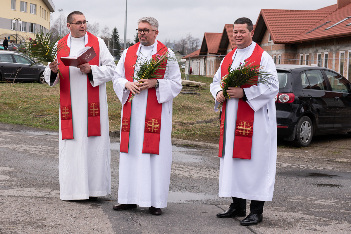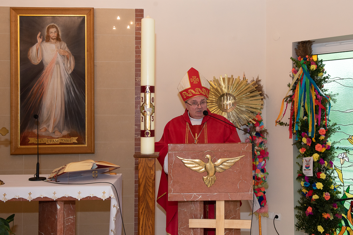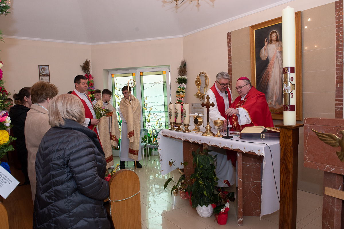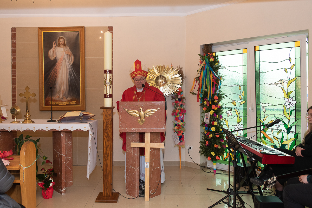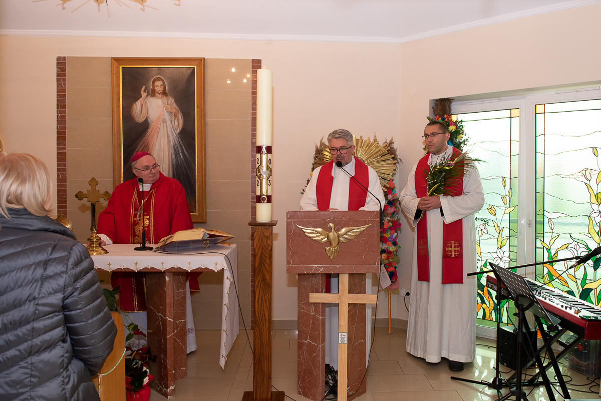 Świętowanie rozpoczęło się procesją upamiętniającą wjazd Jezusa do Jerozolimy oraz odczytaniem Ewangelii przez ks. Łukasza Ślusarczyka i poświęceniem przez ks. Biskupa Palm Wielkanocnych.